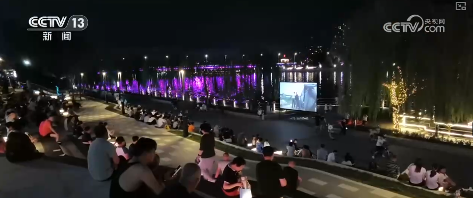 夜幕降臨,大運(yùn)河岸邊燈光閃爍,夜間游船項(xiàng)目迎來了一撥撥游客。不僅能乘船,岸邊免費(fèi)的露天影院更是聚集了不少市民。大家坐在臺階上吹著晚風(fēng),觀看露天熒幕,感受不一樣的夏日浪漫。
