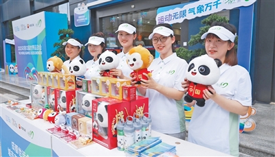 志愿者展示成都世運會文創(chuàng)產(chǎn)品。記者 宋豪新攝