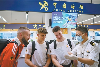 8月5日,成都海關(guān)關(guān)員引導(dǎo)世運(yùn)會(huì)涉賽人員入境通關(guān)。
