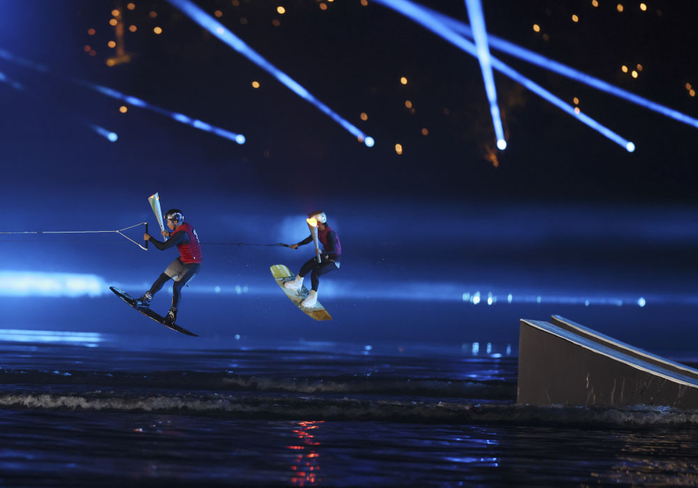 開幕式接近尾聲,中國滑水運動員以滑水的方式疾馳于湖上,共同點燃主火炬,水火交相輝映,現(xiàn)場再次沸騰。
