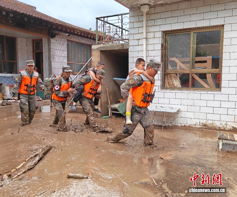 8月8日,武警甘肅總隊(duì)機(jī)動(dòng)支隊(duì)官兵在甘肅省蘭州市榆中縣興隆山村轉(zhuǎn)移被困群眾。劉昆 攝