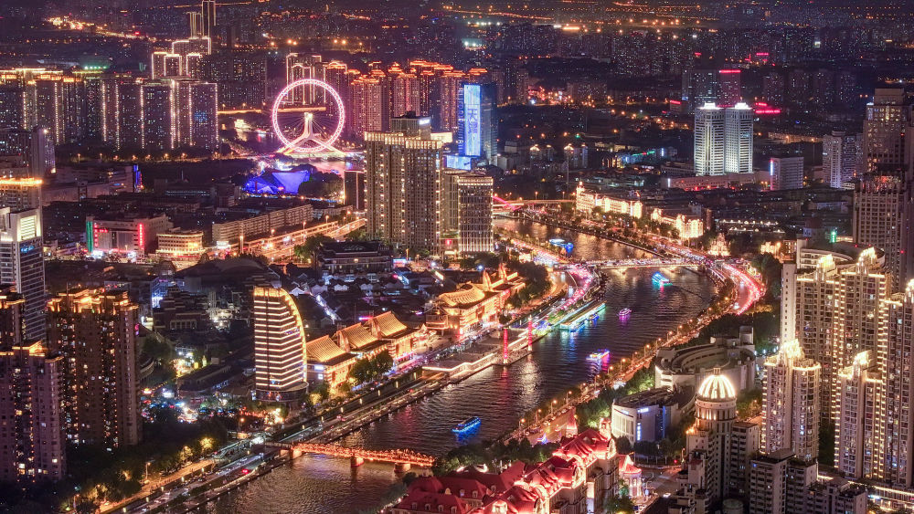 夜幕降臨,海河兩岸璀璨絢麗、千變?nèi)f化:高層建筑披上燈光外衣,勾勒出兩岸高低協(xié)調(diào)、錯(cuò)落有致的天際線;跨越在海河兩岸的座座橋梁,如長(zhǎng)虹臥波、玉帶蜿蜒;游人排隊(duì)乘坐永樂橋“天津之眼”摩天輪,座艙升至最高處,可將大半座城市的繁華盡收眼底……