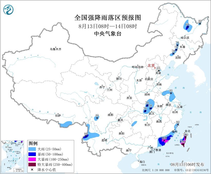 預(yù)計(jì),8月13日08時(shí)至14日08時(shí),黑龍江中部、吉林西部、遼寧西部、河南南部、湖北中部、江蘇北部、云南西部、廣東東部、福建東部和南部、西藏南部、臺(tái)灣島大部等地部分地區(qū)有大到暴雨,其中,福建東南部、廣東東南部、臺(tái)灣島東部和南部等地部分地區(qū)有大暴雨,臺(tái)灣島東部和南部等地局地特大暴雨(250~390毫米)。上述部分地區(qū)伴有短時(shí)強(qiáng)降水(最大小時(shí)降雨量20~50毫米,局地可超過70毫米),局地有雷暴大風(fēng)等強(qiáng)對(duì)流天氣。