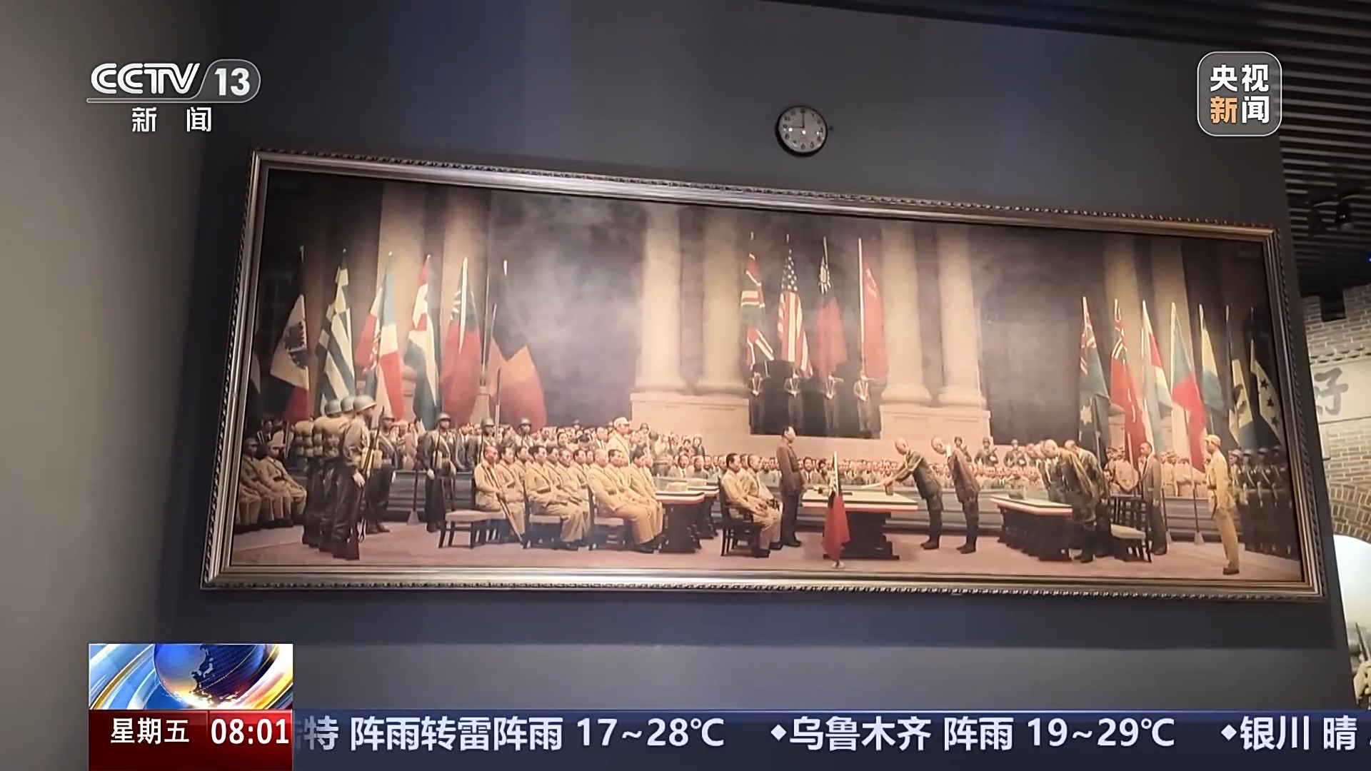 中國人民抗日戰(zhàn)爭紀(jì)念館展覽陳列部副主任 韓小昆:左側(cè)畫面有個角落,有一把空白的椅子是沒有畫人物的。整個作品形象里面有200多個人,但唯獨空了一把椅子。這是基于歷史進(jìn)行的藝術(shù)創(chuàng)作,就是說,在戰(zhàn)爭中犧牲的英烈們也參加了這個受降儀式。
