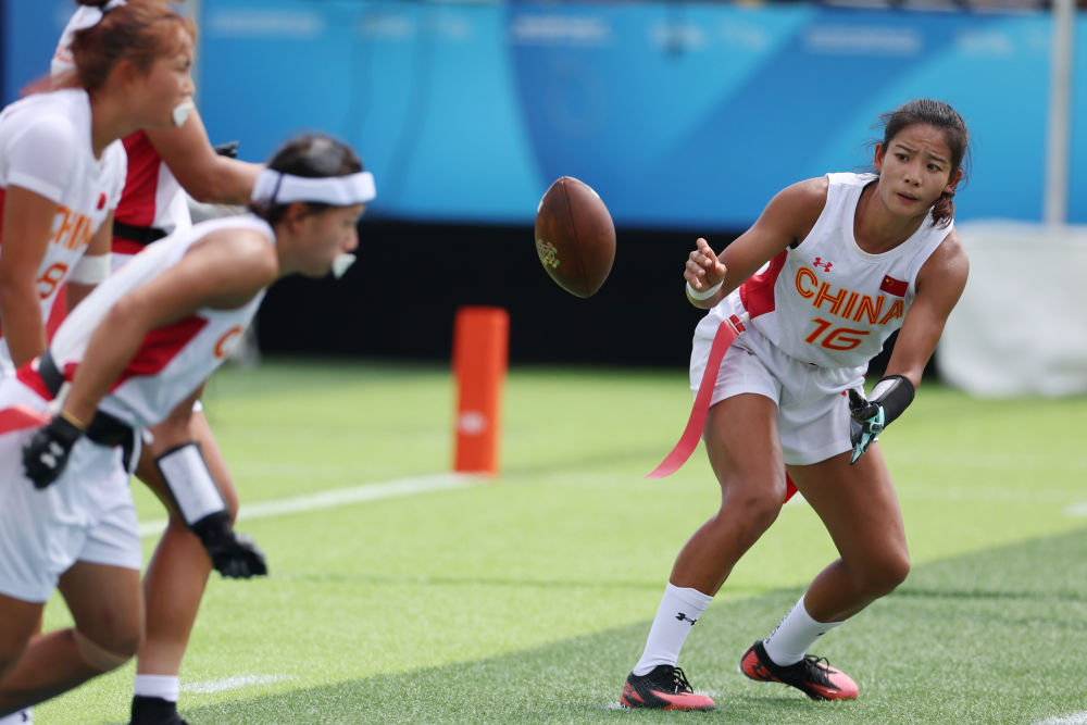 14日,腰旗橄欖球項目開賽。賽場上的激烈比拼與觀眾席上的“雄起”吶喊讓體育場“燃”起來。