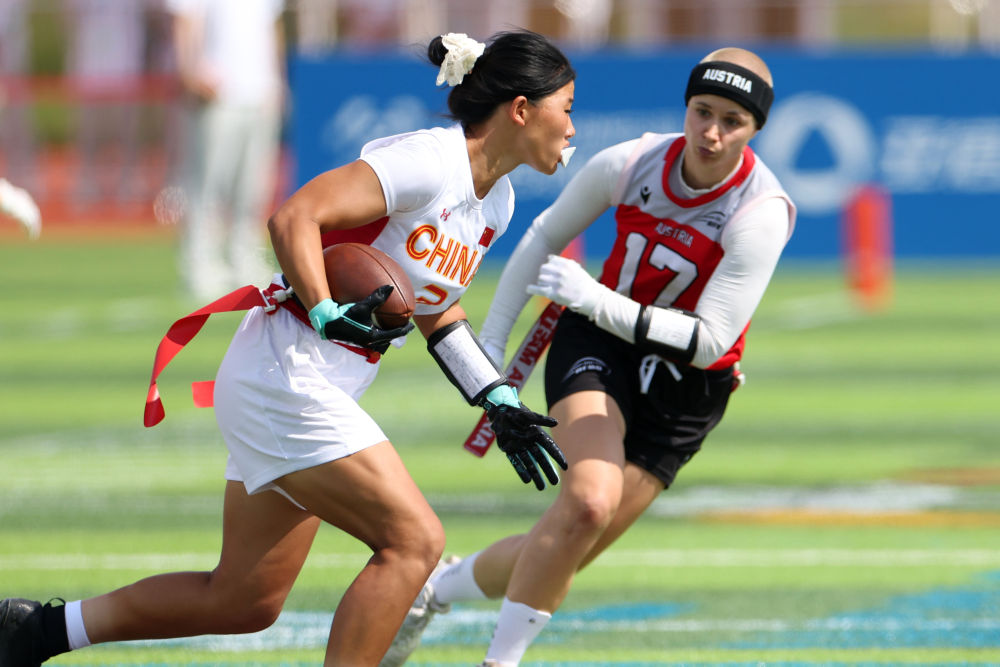 8月14日,在2025年成都世運會腰旗橄欖球女子預(yù)賽A組比賽中,中國隊45:47不敵奧地利隊。圖為中國隊球員高子旋(左)在比賽中。新華社記者 陳斌 攝
