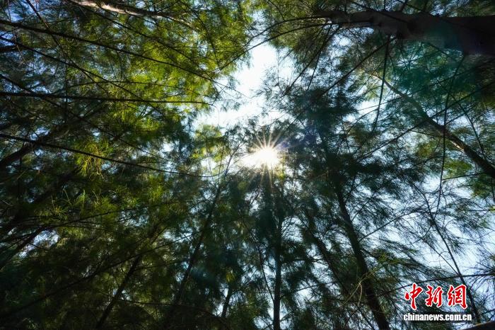 在某島礁,官兵培育的植物種類已達120余種,植被覆蓋率超過90%,成片的木麻黃林、抗風桐林、大葉欖仁樹林鱗次櫛比地分布在各個角落,林下土壤表層出現(xiàn)了落葉和枯草形成的腐殖質(zhì),喬、灌、草銜接互補的森林植物群落生長格局正在加速形成。