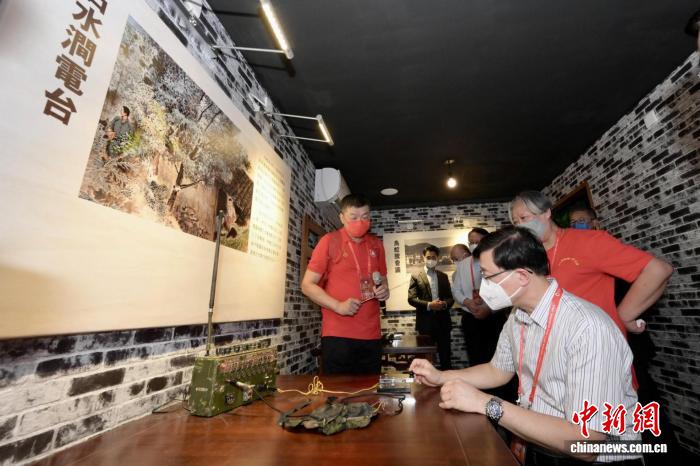 2022年9月3日,香港特區(qū)行政長(zhǎng)官李家超(右一)出席香港沙頭角抗戰(zhàn)紀(jì)念館揭幕典禮時(shí),在紀(jì)念館“石水澗電臺(tái)”展區(qū)體驗(yàn)抗戰(zhàn)時(shí)期電臺(tái)工作。(資料圖)(香港特區(qū)政府新聞處供圖)