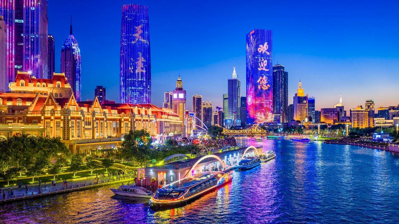 海河則變身流光溢彩的“城市會(huì)客廳”。8月19日起,天津“海河之夜”燈光秀常態(tài)化點(diǎn)亮,兩岸的建筑、橋梁與碼頭被悉數(shù)點(diǎn)亮,中國(guó)與上合國(guó)家的城市地標(biāo)、人文景觀在光影中交相輝映。