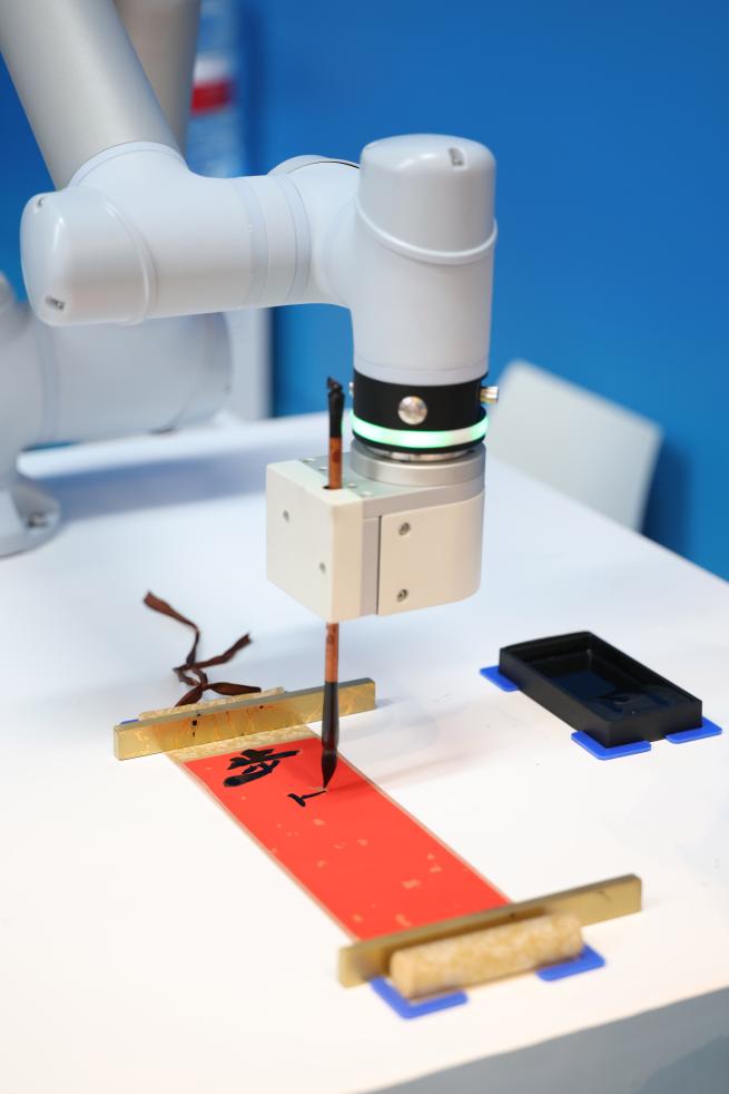 在2025年上海合作組織峰會新聞中心,智能機(jī)器人進(jìn)行書法展示。新華社記者楊青攝