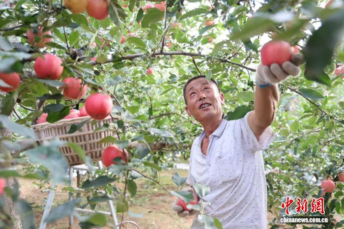 圖為陜西省延安市洛川縣的果農(nóng)正在采摘早熟蘋果。 李進(jìn) 攝