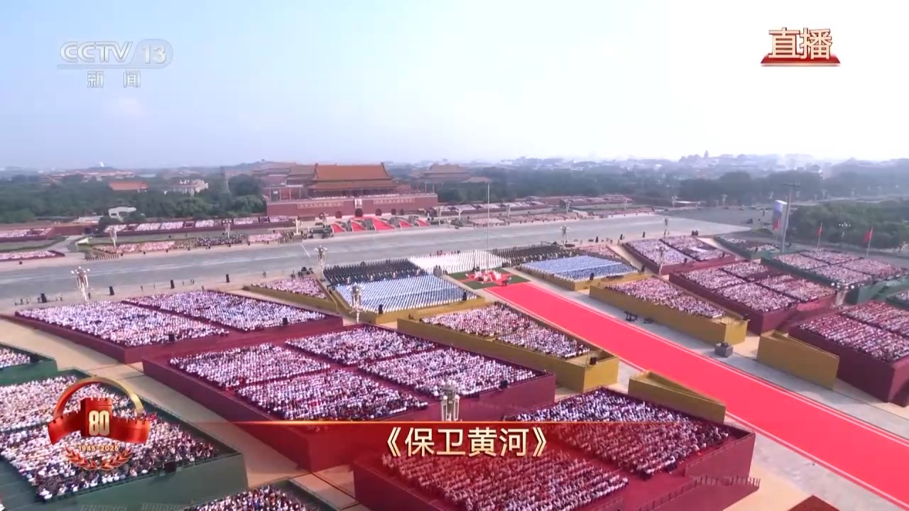 紀(jì)念大會(huì)開始前,天安門廣場上千人軍樂團(tuán)、合唱團(tuán)奏唱抗戰(zhàn)歌曲《保衛(wèi)黃河》。