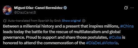迪亞斯-卡內(nèi)爾在社交媒體上發(fā)文稱,“在綿延千年的歷史與激勵(lì)億萬人的當(dāng)下之間,中國今日引領(lǐng)捍衛(wèi)多邊主義與全球治理的斗爭(zhēng)。古巴為支持并踐行這些理念而自豪,并榮幸出席勝利日紀(jì)念活動(dòng)。”