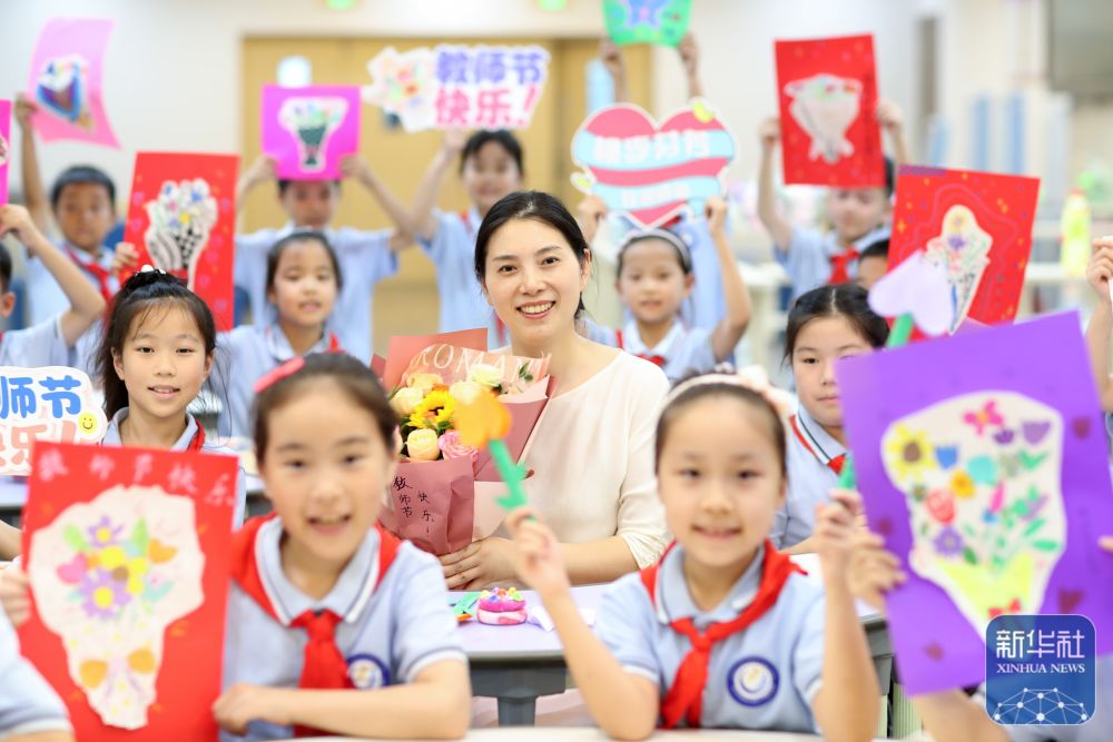 9月9日,在武漢市未來(lái)實(shí)驗(yàn)小學(xué)美林校區(qū),學(xué)生為教師送上節(jié)日祝福。新華社發(fā)(趙軍攝)