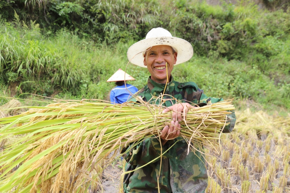貴州省黔東南州鎮(zhèn)遠縣報京鄉(xiāng)的農戶展示稻穗,臉上洋溢著笑容(央廣網發(fā) 張佳怡 攝)