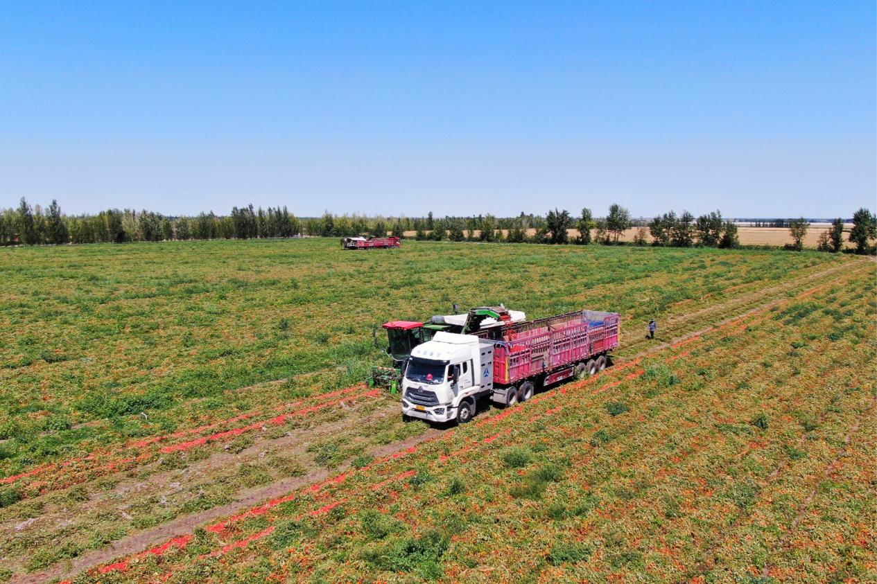 吉木薩爾縣三臺鎮(zhèn)的1200余畝加工番茄迎來了豐收季。在羊圈臺子村,種植戶俞瑞海家的300畝番茄地里,現代化采收機械正來回穿梭。