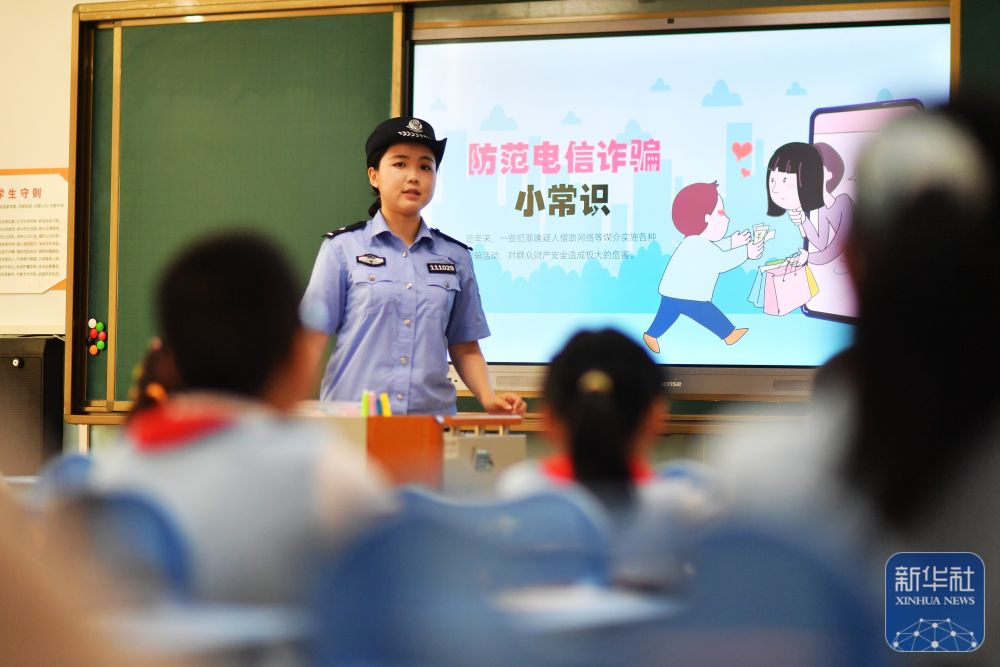 9月15日,在山東省青島市市北區(qū)延安二路小學開展的網絡安全教育主題活動上,民警為學生們講解防范電信詐騙小常識。新華社發(fā)(王海濱攝)