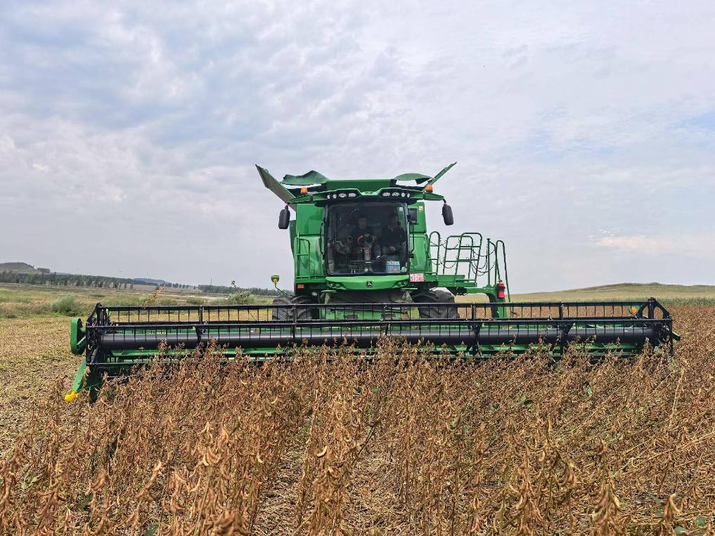 在黑龍江省七臺(tái)河市勃利縣恒山玉米專業(yè)合作社的一處地塊,一臺(tái)臺(tái)大型收割機(jī)往來穿梭,一排排飽滿的大豆植株被精準(zhǔn)卷入機(jī)身,金黃的豆粒隨即通過出糧口涌入運(yùn)糧車。