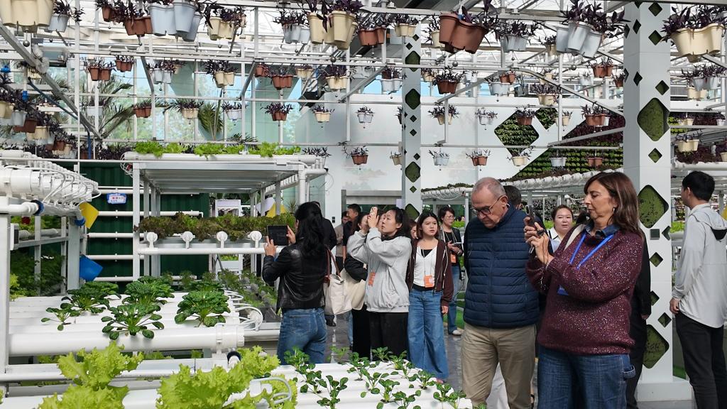 走進(jìn)昌吉新疆農(nóng)業(yè)博覽園內(nèi)的垂直農(nóng)業(yè)展示區(qū)、葉菜工廠(chǎng)示范區(qū)和果菜工廠(chǎng)示范區(qū),目睹無(wú)土栽培、無(wú)人機(jī)灌溉、光合作用智能調(diào)控等一系列農(nóng)業(yè)高科技應(yīng)用為作物“量身定制”生長(zhǎng)環(huán)境,參訪(fǎng)議員們紛紛拍照記錄。