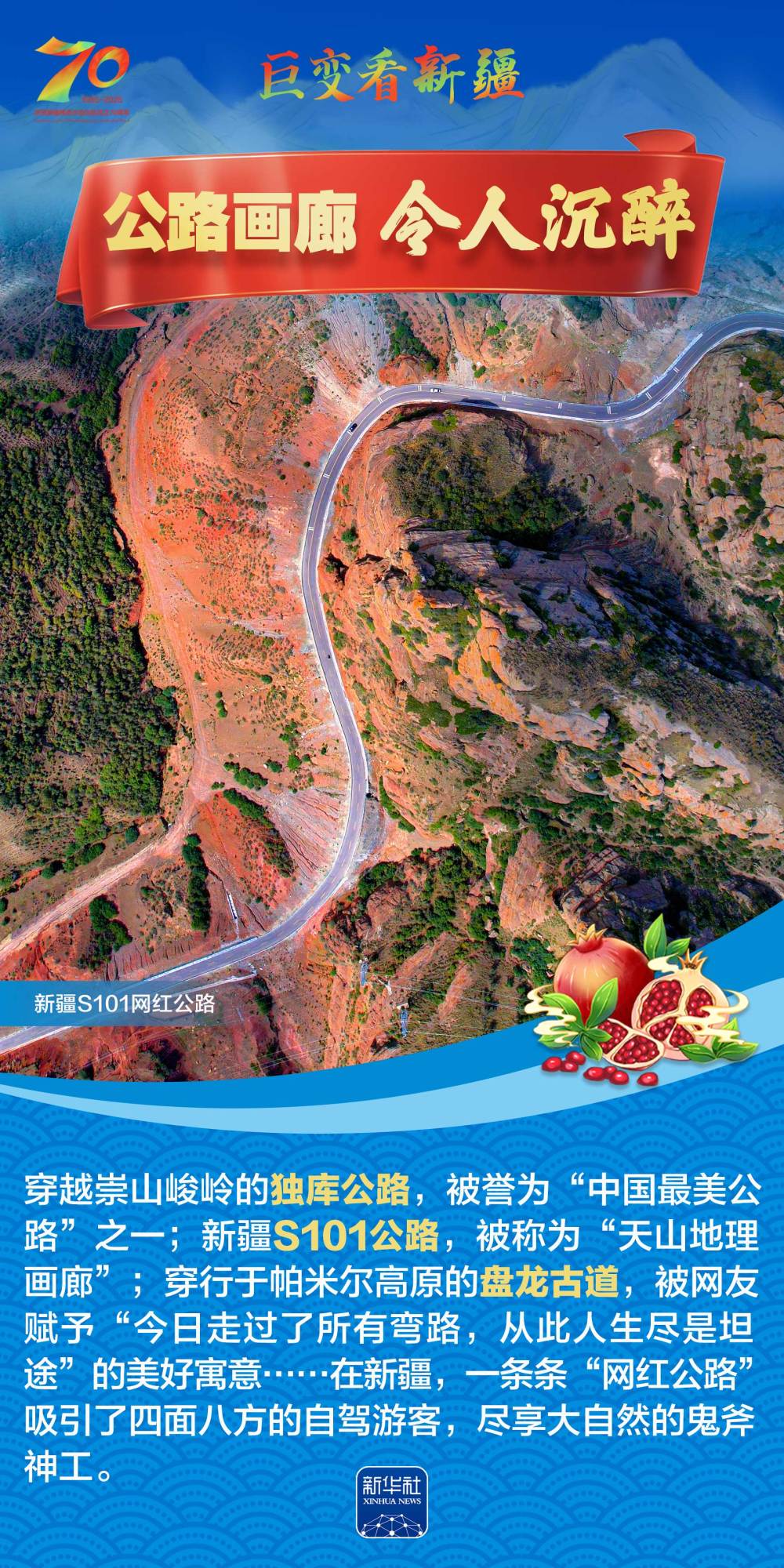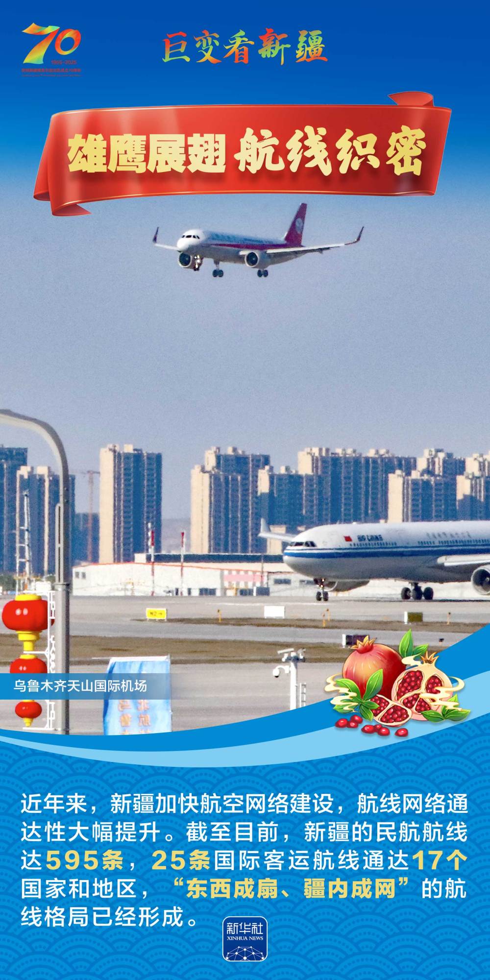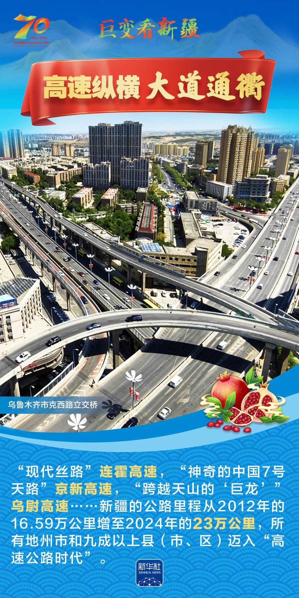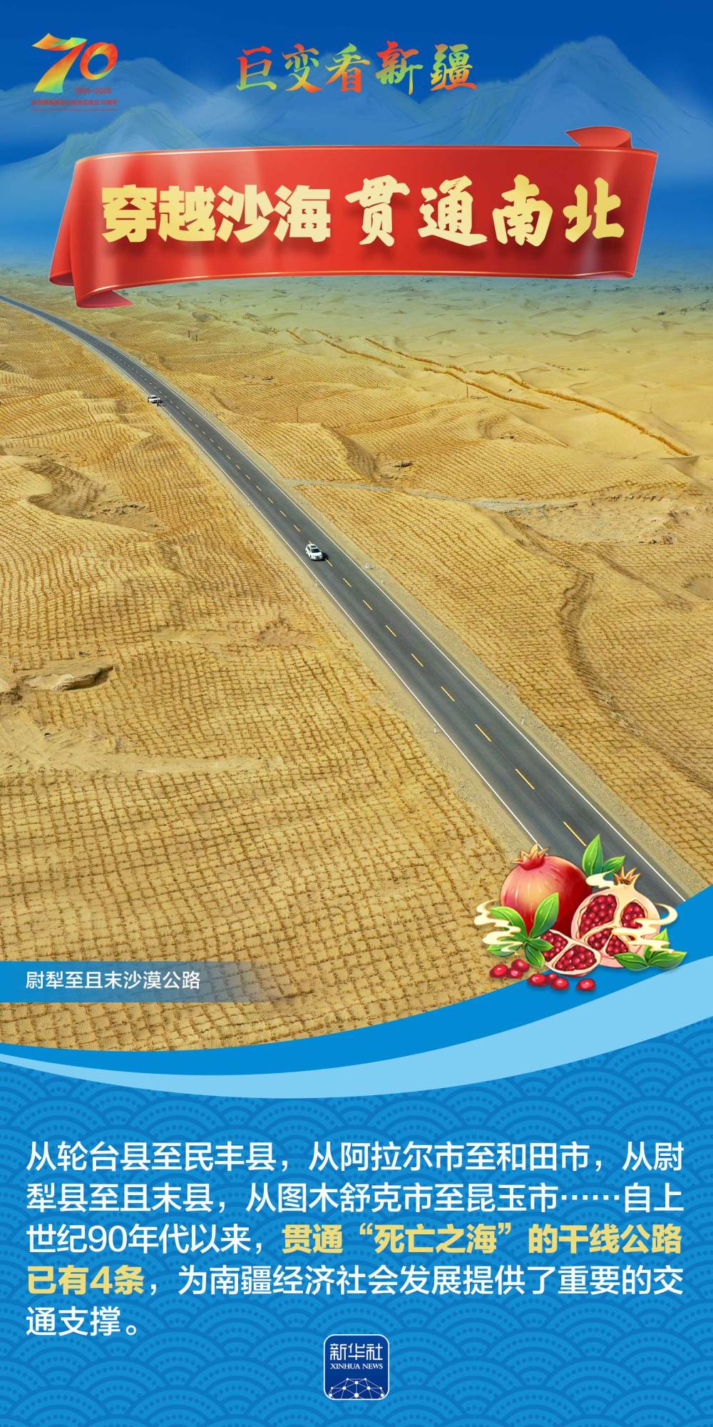 今年是新疆維吾爾自治區(qū)成立70周年。70年來,新疆的交通建設(shè)日新月異。從駝鈴聲聲、馬蹄嘚嘚到鐵流縱橫、銀鷹高翔,一座座交通樞紐輻射四方,一條條“鋼鐵巨龍”蜿蜒逶迤,一個個支線機場星羅棋布,現(xiàn)代化的新疆立體交通網(wǎng)絡(luò)日益形成。讓我們跟隨這組海報,一起見證穿越“三山兩盆”、貫通歐亞大陸的新時代新疆交通畫卷。