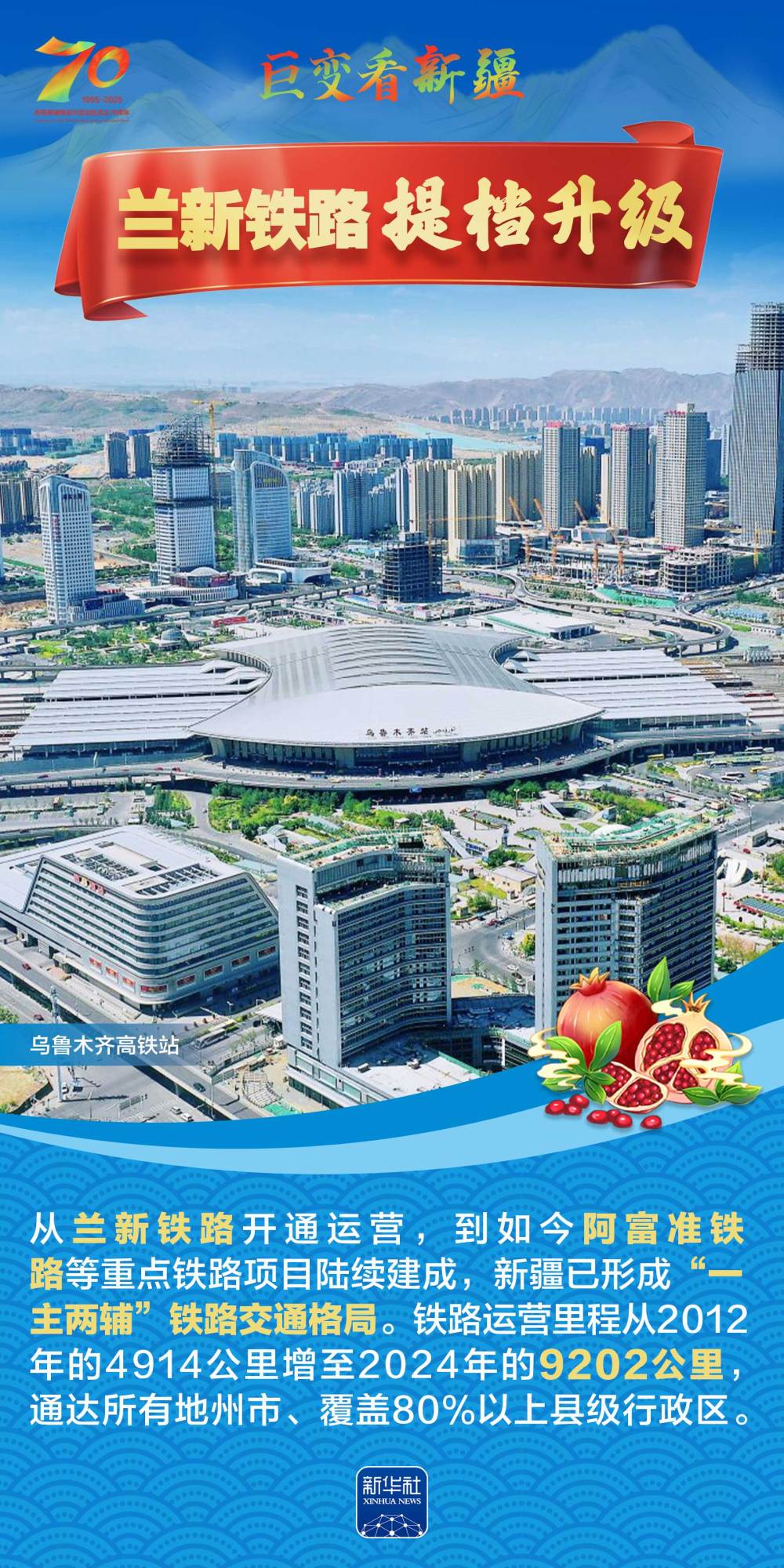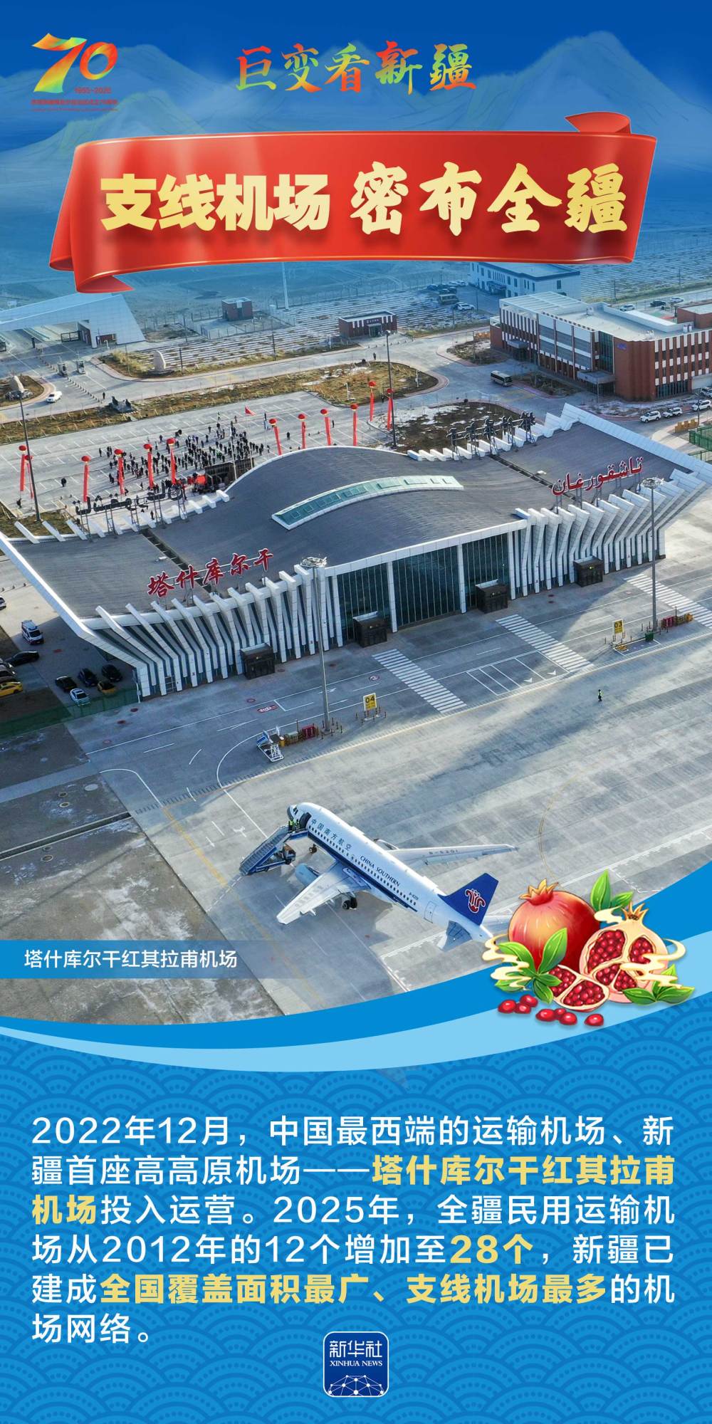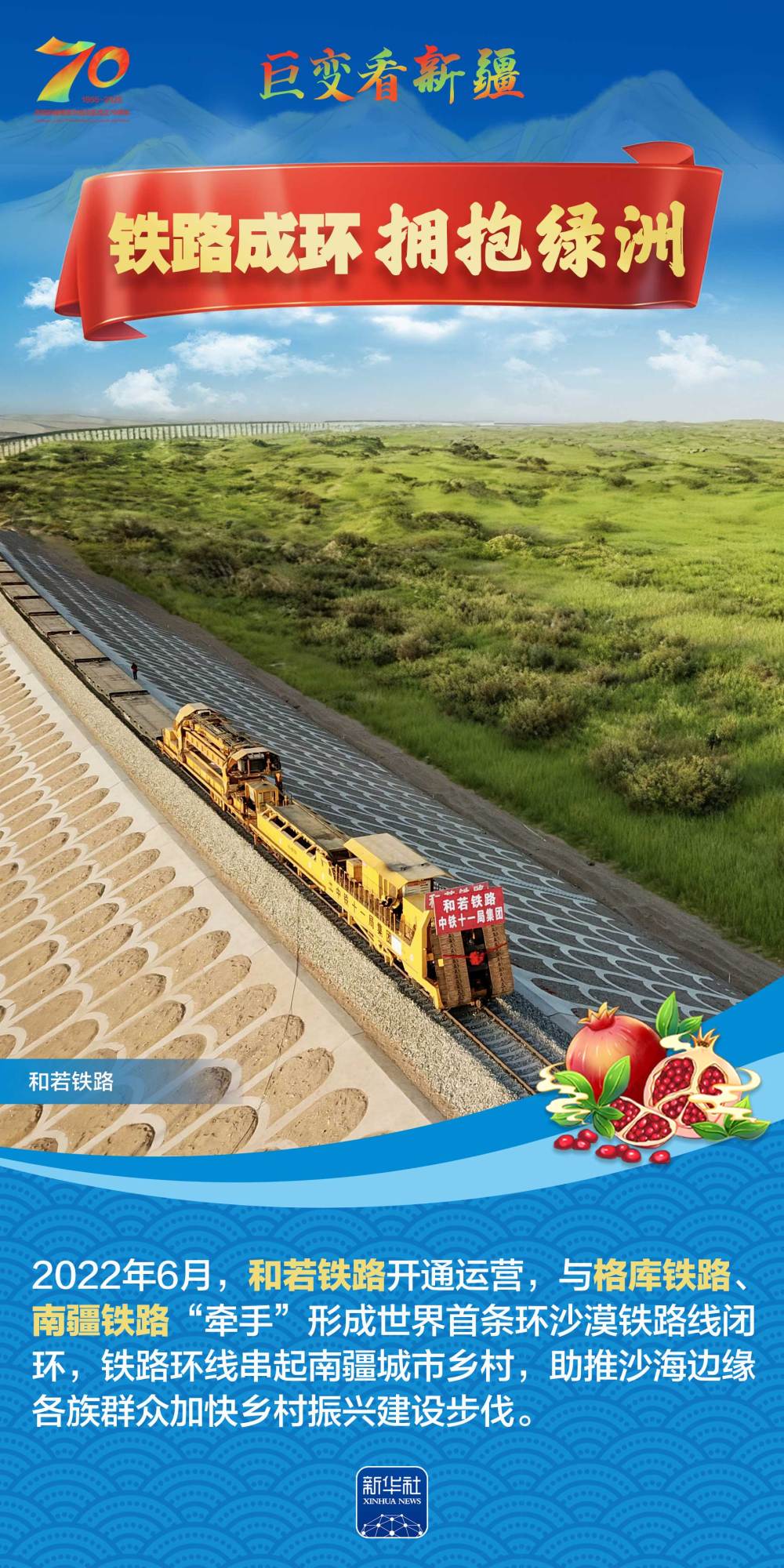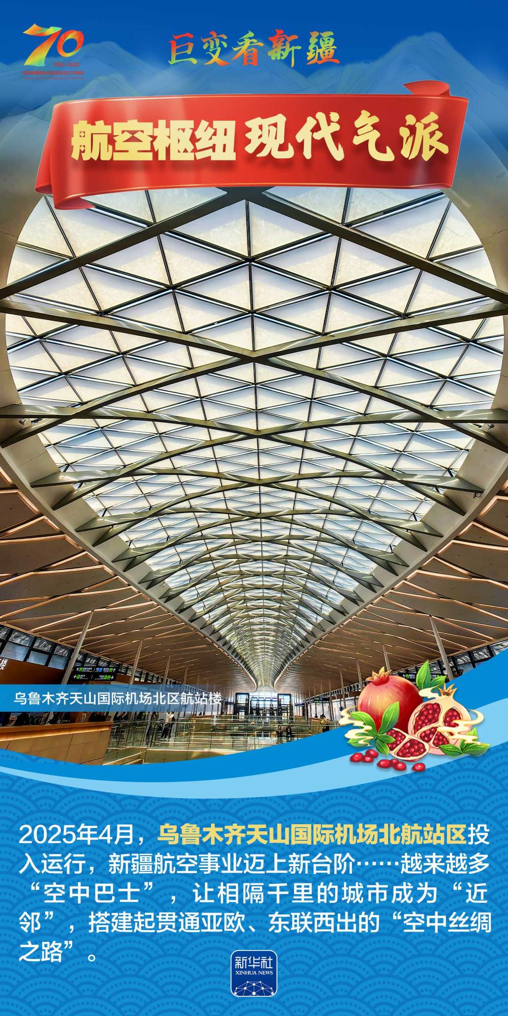 今年是新疆維吾爾自治區(qū)成立70周年。70年來,新疆的交通建設(shè)日新月異。從駝鈴聲聲、馬蹄嘚嘚到鐵流縱橫、銀鷹高翔,一座座交通樞紐輻射四方,一條條“鋼鐵巨龍”蜿蜒逶迤,一個個支線機場星羅棋布,現(xiàn)代化的新疆立體交通網(wǎng)絡(luò)日益形成。讓我們跟隨這組海報,一起見證穿越“三山兩盆”、貫通歐亞大陸的新時代新疆交通畫卷。