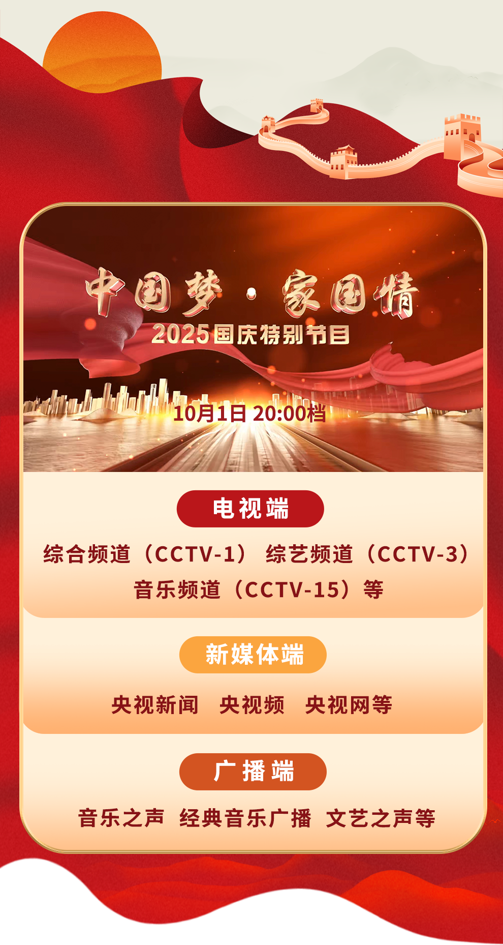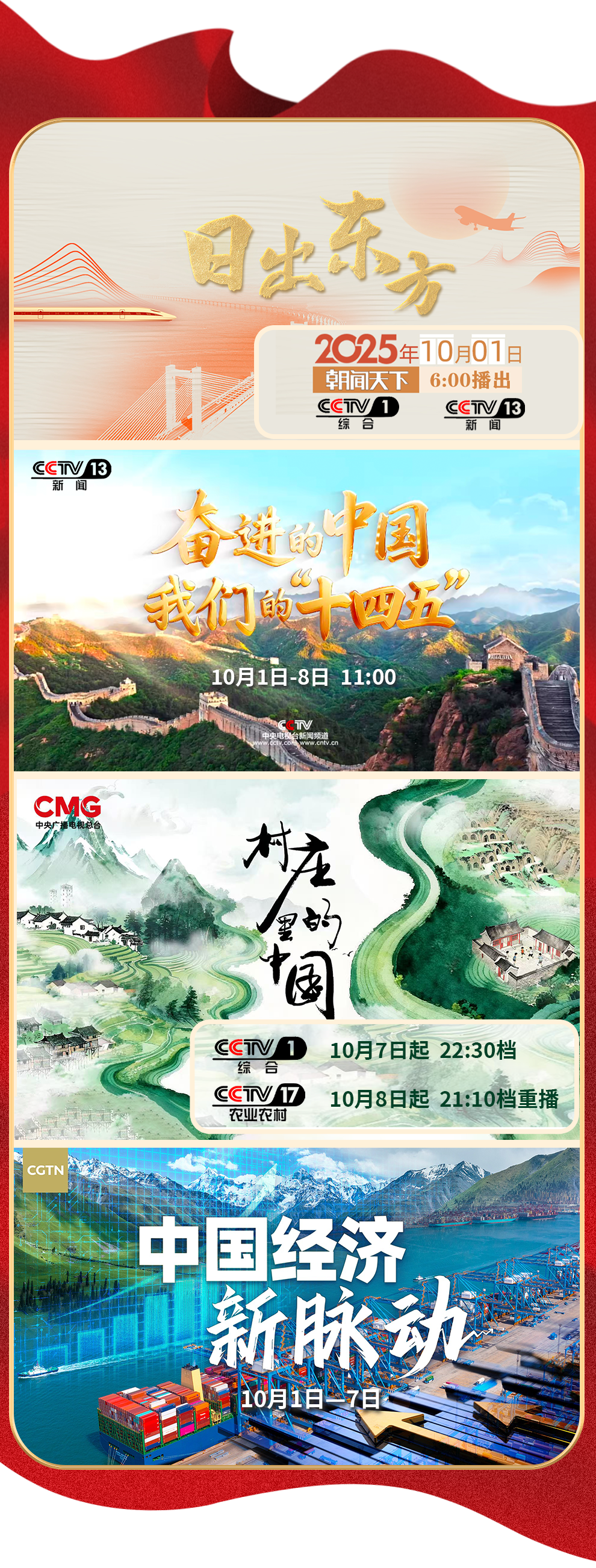 金秋潑彩山河醉,家國同輝氣象新。10月1日晚八點,《中國夢 家國情——2025國慶特別節(jié)目》將在《我愛你中國》的大合唱中拉開大幕。特別節(jié)目走進城市地標與文化遺址,展現(xiàn)山河新貌與奮斗者群像。經(jīng)典曲目、交響合唱、新創(chuàng)歌曲傳遞濃濃家國情懷??箲?zhàn)老兵、奧運冠軍、各行各業(yè)奮斗者深情講述……整場節(jié)目,洋溢著中華民族偉大復興勢不可擋的壯志豪情。