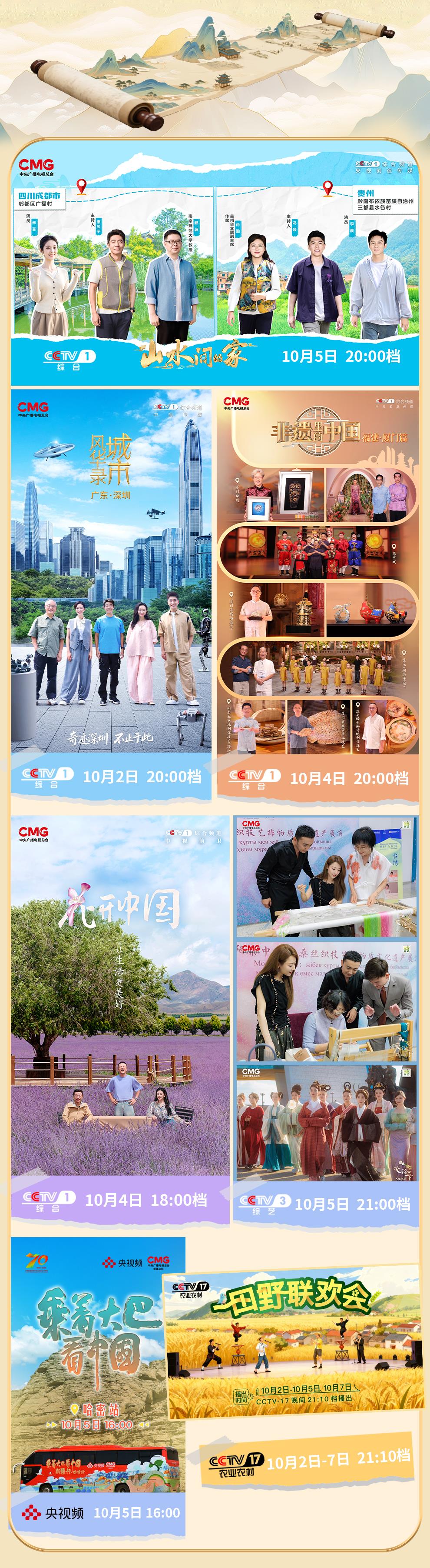 八天假期,想好去哪兒玩了嗎?來,跟著總臺去打卡!頭兩站:四川、貴州!《山水間的家(第四季)》“山水小分隊”邀你在川西林盤探韭香產(chǎn)業(yè),在黔南山鄉(xiāng)看巖椒成林。第三站:廣東。《城市風華錄》帶你去深圳探訪全球首家機器人6S店,感受“奇跡之城”向新向好的澎湃動力。第四站:福建。珠繡、漆線雕、閩南童謠、高甲戲……看《非遺里的中國》,領略廈門非遺之美。第五站:新疆。從《花開中國》開啟一場跨越天山的芬芳之旅,在《衣錦天下 絲路季》發(fā)現(xiàn)絲綢之路上的中國審美,《乘著大巴游中國》探尋哈密甜美密碼。第六站:內蒙古。在通遼參加《田野聯(lián)歡會》,體驗鄉(xiāng)土文化新活力。這八天的旅程,你不會錯過雄奇的風光、古老的文化、新奇的創(chuàng)造,還有熱氣騰騰的生活。