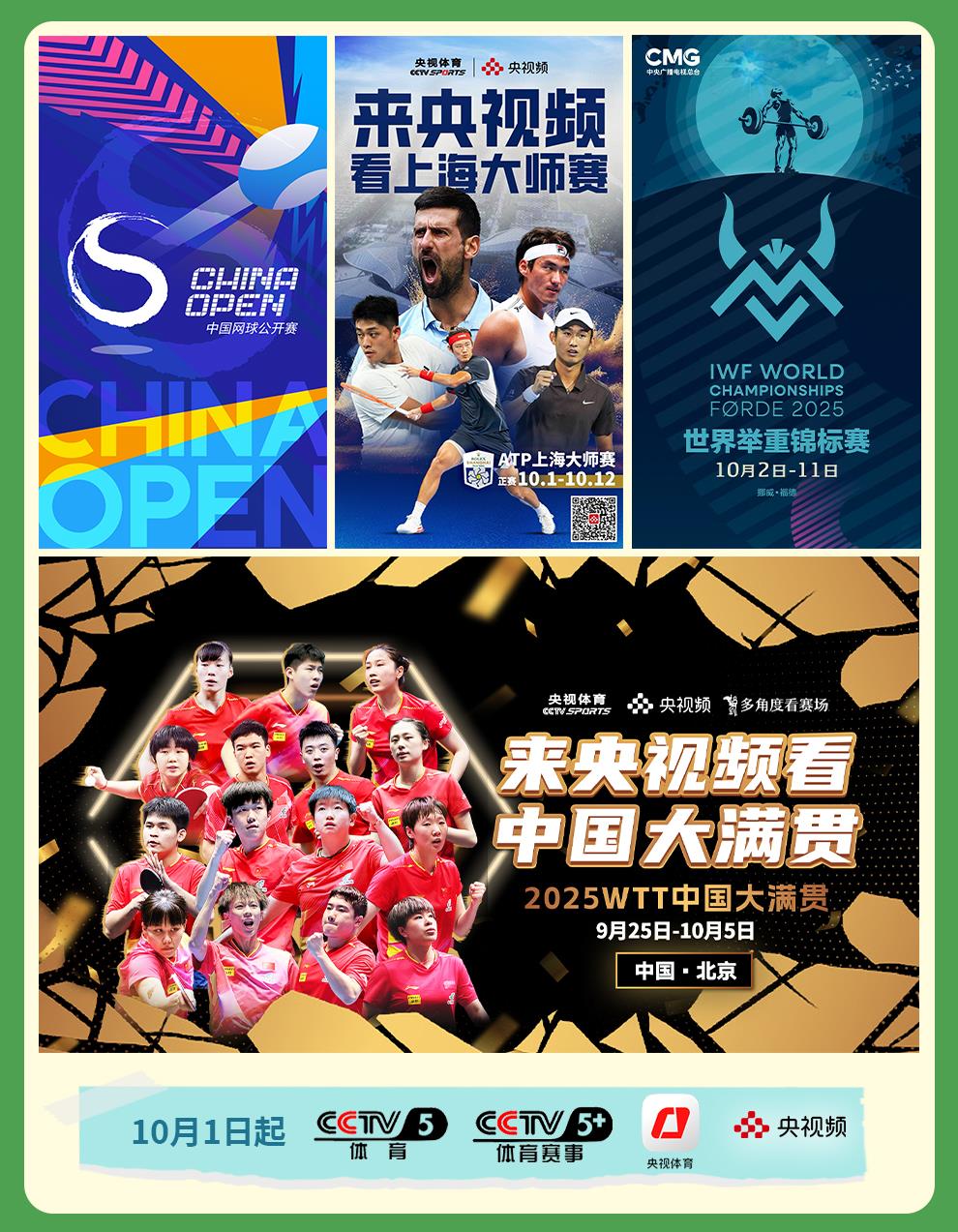 精彩賽事,激情無限!《2025年中國網(wǎng)球公開賽》《2025年世乒聯(lián)大滿貫賽(中國站)》《2025年ATP1000男子網(wǎng)球大師賽(上海賽)》《2025年世界舉重錦標賽》等黃金賽事接連開賽,讓體育迷暢享運動的無窮魅力。