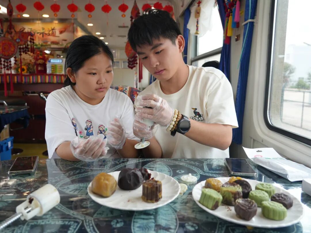 除了歌舞與燈謎,列車工作人員還精心準(zhǔn)備了互動體驗環(huán)節(jié)。旅客圍坐在一起,親手制作月餅、拼裝手工燈籠。工作人員還為參與活動的旅客送上書簽,大家提筆寫下對家人的中秋祝愿,字里行間滿是牽掛與祝福?;顒游猜暎碇鴿h服的列車工作人員端來一盤香甜的滇式月餅,邀請旅客品嘗。