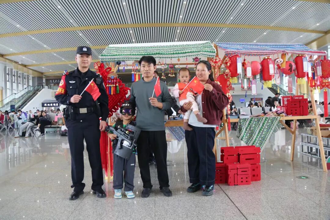 候車大廳內(nèi),紅色的國旗與中秋元素裝飾隨處可見。志愿者向旅客熱情遞上文旅宣傳冊,介紹紅河州特色景點與動車出行攻略。精彩的民族歌舞表演吸引了旅客紛紛駐足,他們舉起手機記錄下精彩瞬間。