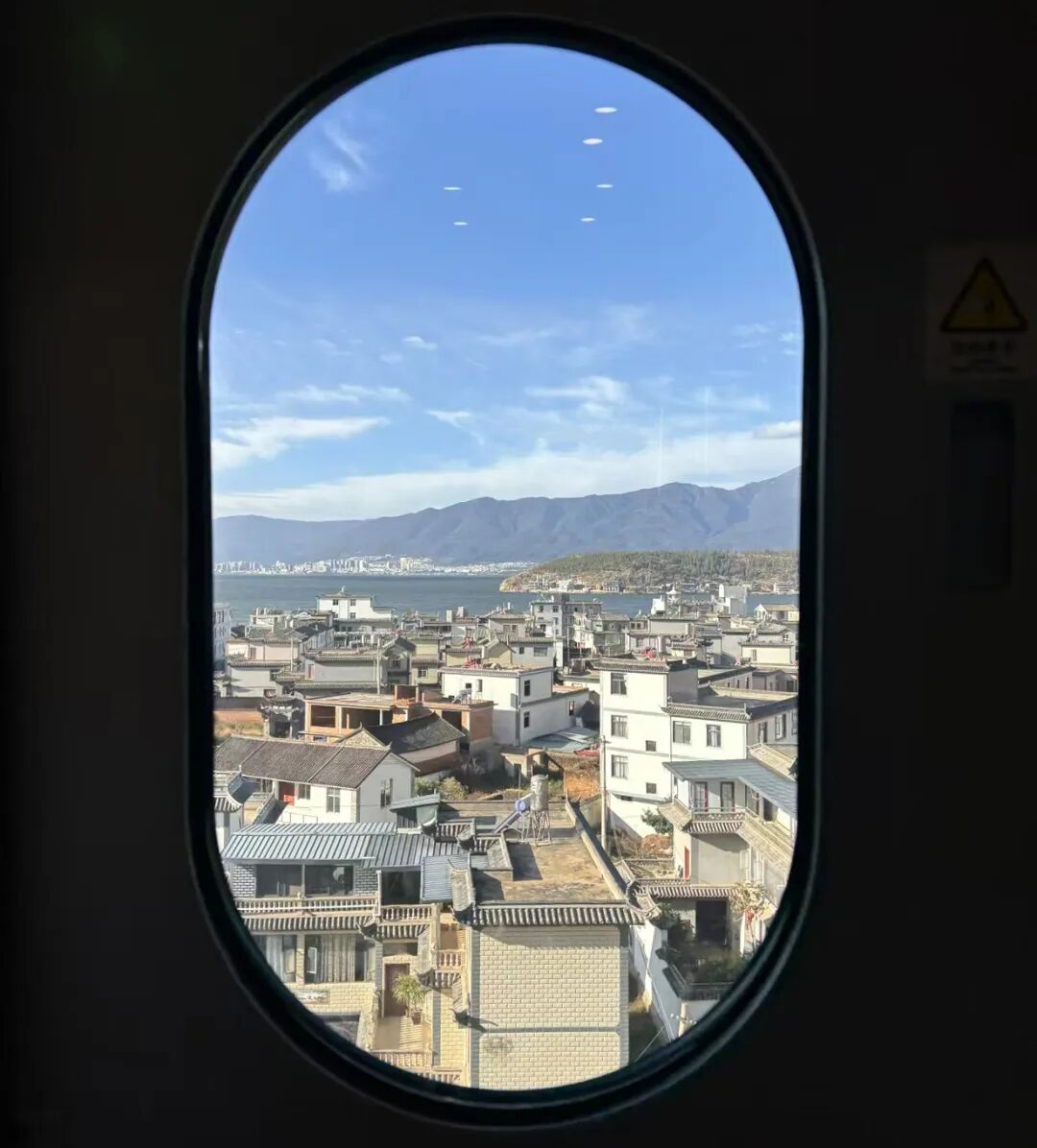 列車載著風(fēng)穿行,車窗恰似畫框,將大理的詩意牢牢框住。澄澈藍天如被水洗過的藍綢,洱海似一汪碎了的藍寶石,在日光下漾著粼粼波光,遠處青山如黛,靜默相依。近處,白墻黛瓦的村落像從時光深處走來的精靈,挨挨擠擠。屋頂?shù)木€條或平直或微翹,似在無聲訴說著歲月故事。隔著車窗,也能感受到“詩和遠方”,真叫人沉醉在這旅途中的“大理藍”里。(作者:李婭姣)