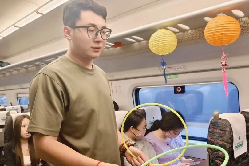 車廂內(nèi),懸掛的燈籠點(diǎn)綴出濃濃節(jié)日氣息。青年職工演唱歌曲《看月亮爬上來》,熟悉的旋律引發(fā)旅客共鳴;“舉頭望明月(打一中藥名)”等趣味猜燈謎活動,吸引不少旅客踴躍參與;身著漢服的乘務(wù)員帶領(lǐng)孩子們玩起傳統(tǒng)套圈游戲,月餅、玩偶作獎品,歡聲笑語不斷。