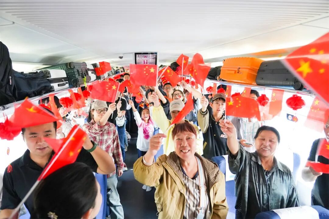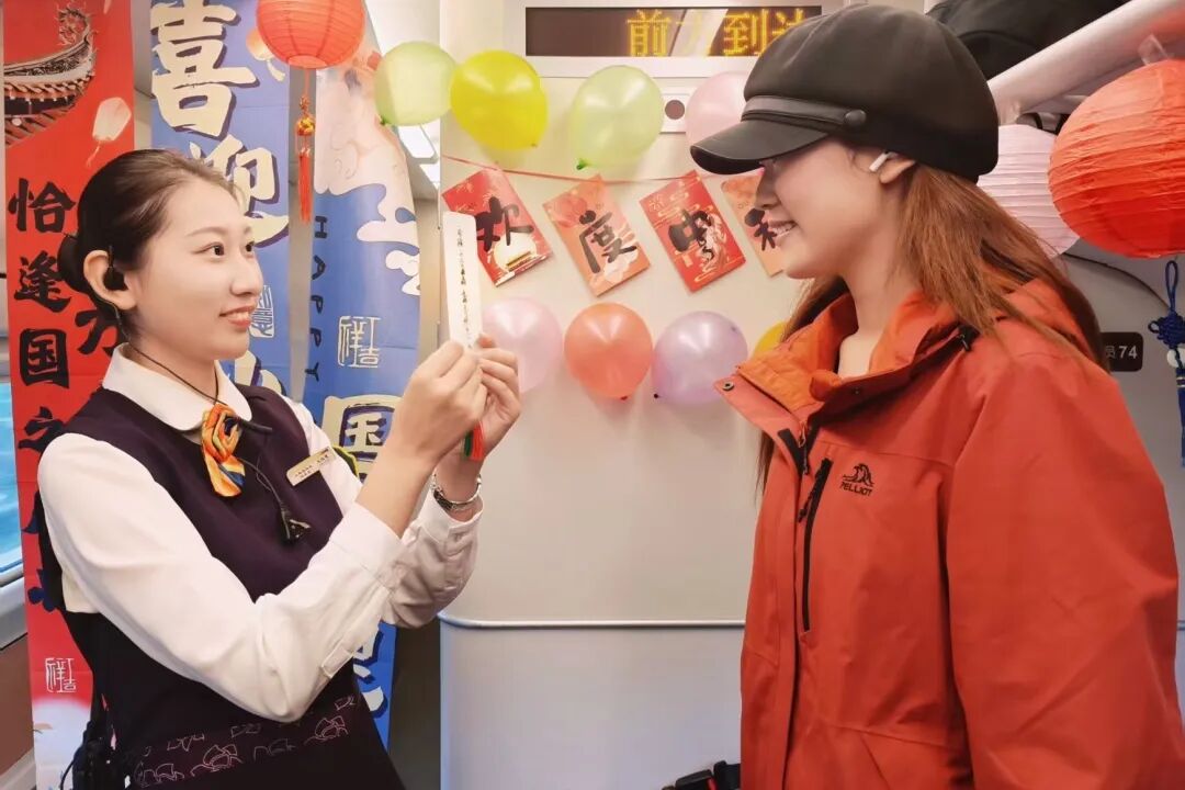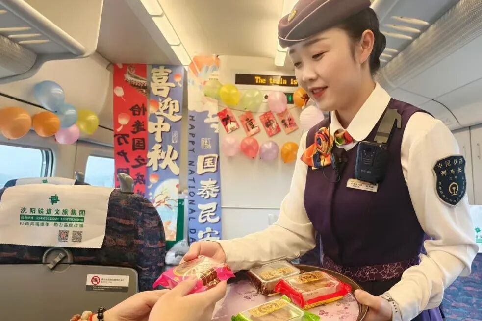 熱鬧的活動讓車廂變成歡樂的海洋,列車員將月餅等精美伴手禮送給旅客,為他們送上節(jié)日的祝福。