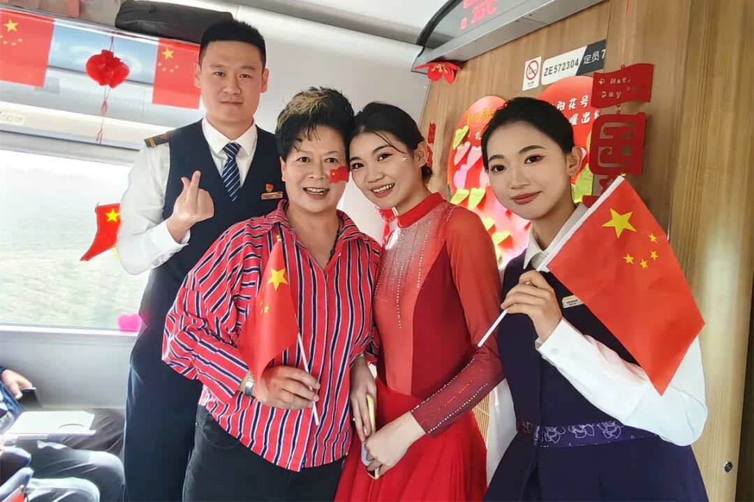 車廂內(nèi)掛滿條幅、彩帶和中國結(jié),洋溢著節(jié)日的喜慶氛圍。在舞蹈《親愛的你啊》的優(yōu)美旋律中,列車聯(lián)歡拉開序幕。