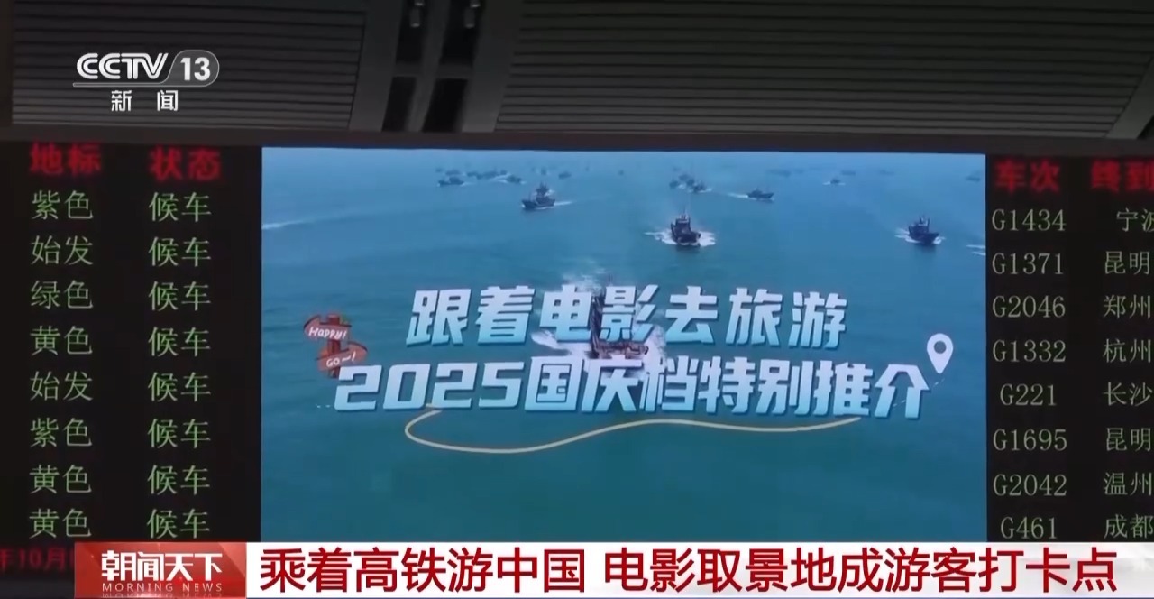據(jù)了解,為持續(xù)推動(dòng)“電影+”業(yè)態(tài)創(chuàng)新,國慶期間,在全國3000多個(gè)鐵路客運(yùn)車站、4200多組動(dòng)車組列車的車廂電視上,集中播放《跟著電影去旅游》等影旅主題推介視頻,不僅展示熱門電影取景地,還聯(lián)動(dòng)多條鐵路旅游專線提供出行指引,邀請旅客體驗(yàn)“鐵路+電影”的出行新方式。