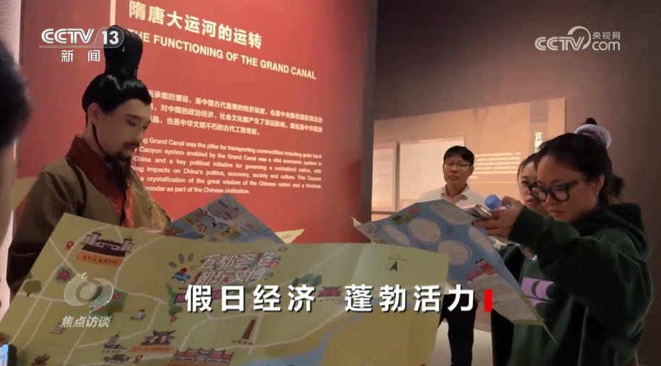 在河南洛陽的隋唐大運(yùn)河文化博物館,一位身穿古裝的角色扮演者突然走向游客,簡單自我介紹后,將特制的文博地圖送到大家手中,并邀請眾人一起漫步展廳,沉浸式探尋大運(yùn)河的前世今生。