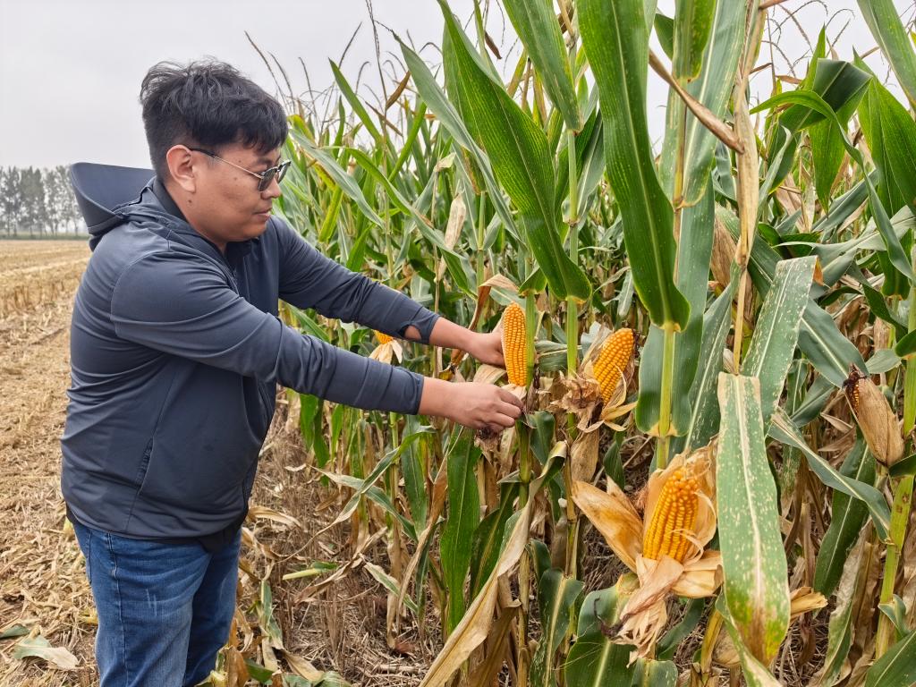 2025年10月10日,安徽省宿州市蕭縣金旺家庭農(nóng)場負責(zé)人許大賓查看待收割的玉米品質(zhì)。新華社記者 水金辰 攝