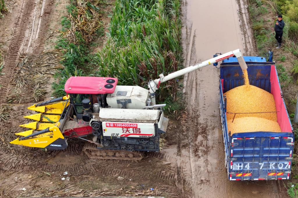 2025年10月11日,在安徽省淮北市濉溪縣百善鎮(zhèn)張莊村,從河南駐馬店調(diào)運過來的履帶式收割機在收割玉米。新華社發(fā)(徐弘揚 攝)