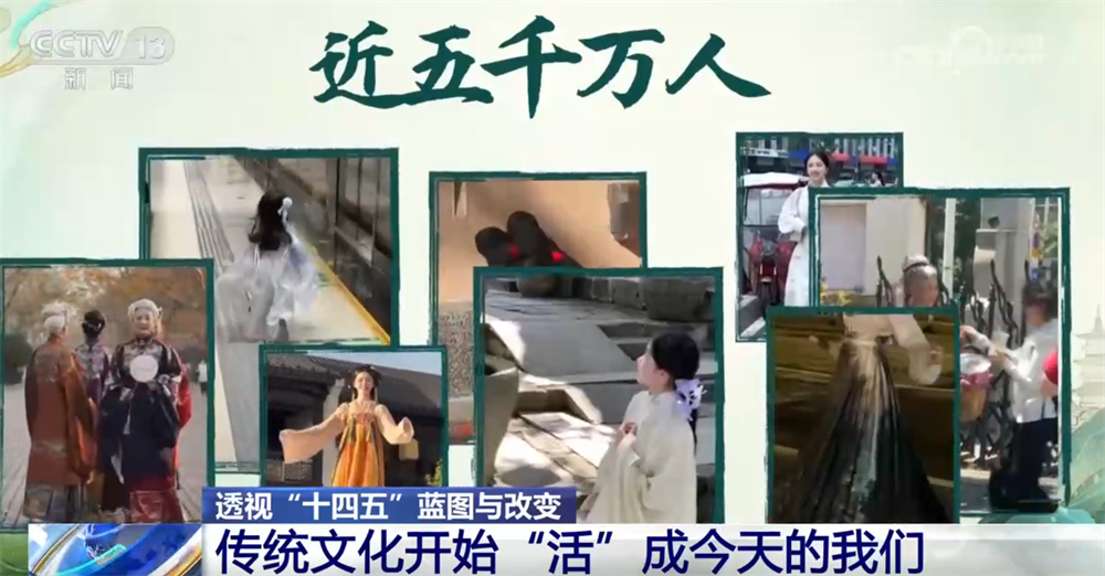 央視網(wǎng)消息:過(guò)去,我們?cè)谡n本里背古詩(shī)、學(xué)歷史;今天,我們身著漢服走上街頭,在旅行打卡、短視頻創(chuàng)作中重新感受傳統(tǒng)。五千年的文化正在從書頁(yè)走向街頭,從展廳走進(jìn)生活,成為我們?nèi)粘5囊徊糠??!笆奈濉钡奈迥?,讓文化真正“活”在了?dāng)下,也“活”進(jìn)了我們的生活。