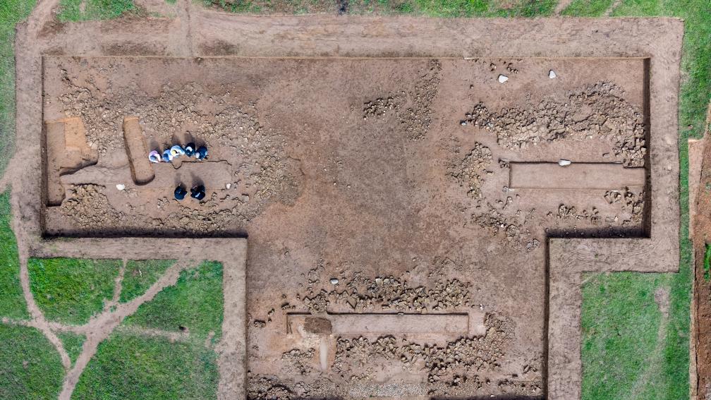 10月15日,在甘肅省隴南市禮縣四角坪遺址考古發(fā)掘現(xiàn)場(chǎng),考古工作人員觀察一處闕門遺跡(無(wú)人機(jī)照片)。新華社記者 郎兵兵 攝