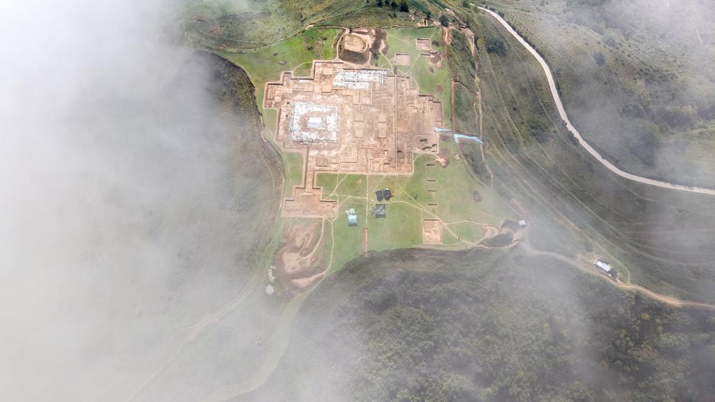 這是10月15日拍攝的甘肅省隴南市禮縣四角坪遺址考古發(fā)掘現(xiàn)場(chǎng)(無(wú)人機(jī)照片)。新華社記者 陳斌 攝