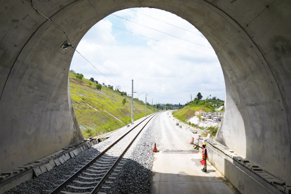 ↑這是10月10日在馬來(lái)西亞彭亨州拍攝的馬東鐵項(xiàng)目,從隧道口望出去一片綠意盎然(無(wú)人機(jī)照片)。