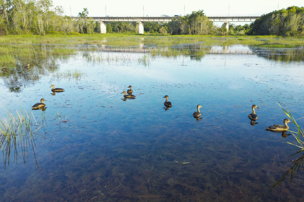 ↑這是10月10日在馬來(lái)西亞彭亨州馬東鐵項(xiàng)目附近拍攝的幾只野鴨(無(wú)人機(jī)照片)。