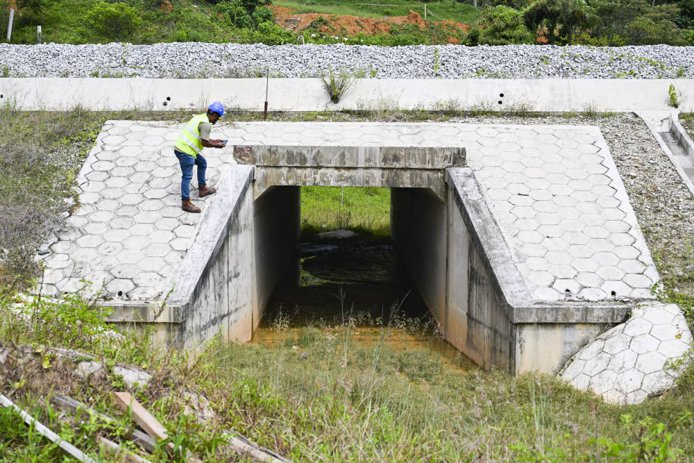 ↑這是10月10日在馬來(lái)西亞彭亨州馬東鐵項(xiàng)目拍攝的環(huán)境官?gòu)亍とf(wàn)·巴祖,他在一處動(dòng)物涵洞檢查馬來(lái)貘、野豬等野生動(dòng)物的蹤跡。