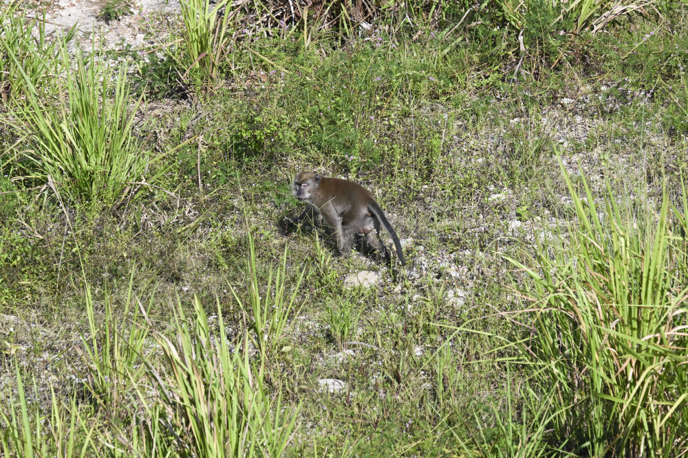 ↑10月10日,在馬來(lái)西亞彭亨州,一只猴子從馬東鐵項(xiàng)目的一處橋洞下穿過(guò)。