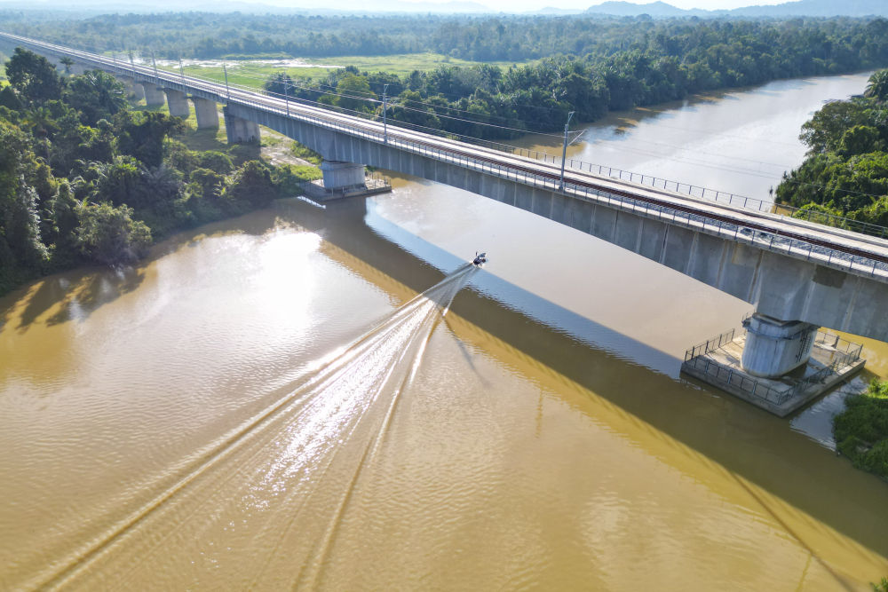 ↑10月10日,在馬來(lái)西亞彭亨州,一艘船駛過(guò)馬東鐵項(xiàng)目跨關(guān)丹河特大橋(無(wú)人機(jī)拍攝)。
