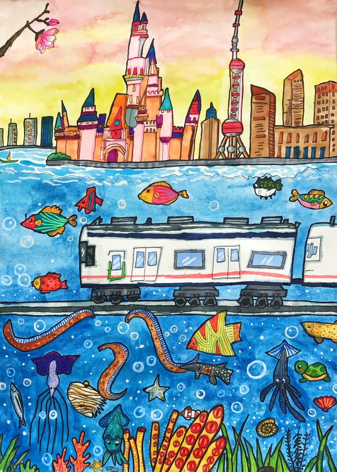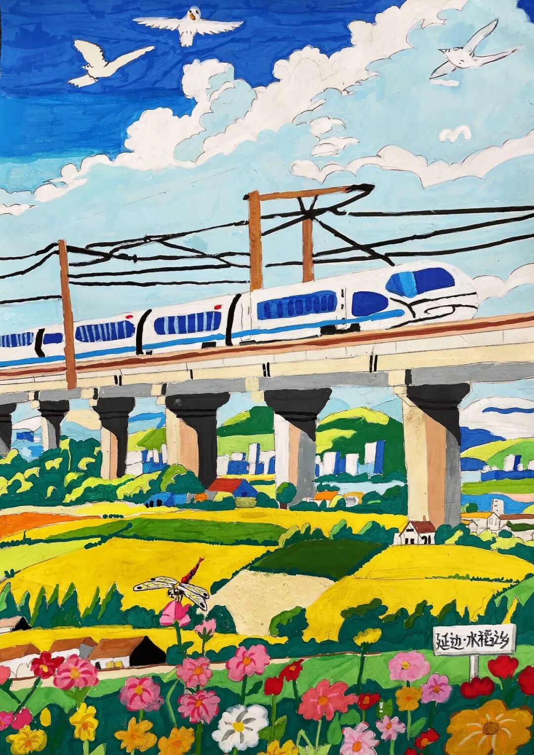 不遠(yuǎn)處徐鹽高鐵上,銀白色的高鐵像一道流星劃過(guò)水鄉(xiāng)。我的鉛筆在本子上沙沙作響,把窗外的景色畫(huà)下來(lái):成片的藕田里,粉白的荷花搖曳生姿;戴著斗笠的農(nóng)民在稻田里忙碌,身后的水渠泛著粼粼波光。列車員阿姨推著小推車走來(lái),“瓜子飲料礦泉水”的吆喝聲,和車輪與鋼軌的碰撞聲交織在一起,成為獨(dú)屬于旅途的音樂(lè)。