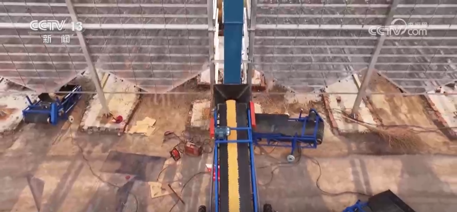 烘干后的玉米去哪里了?大家抬頭看,答案在樓頂上這些高速傳送帶,玉米通過(guò)傳送帶進(jìn)入下一個(gè)加工區(qū)。