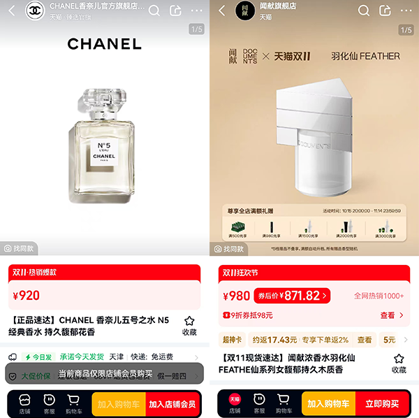 近年來,高端市場雖有國際品牌強勢主導但仍跑出了觀夏、聞獻和Melt Season等定位高端的國貨香水品牌,產品每毫升單價甚至高于國際品牌。以香奈兒5號香水為參考,天貓旗艦店中香奈兒5號35ml香水售價920元,每毫升單價26.28元,而聞獻羽化仙30ml香水售價980元,每毫升單價32.66元。