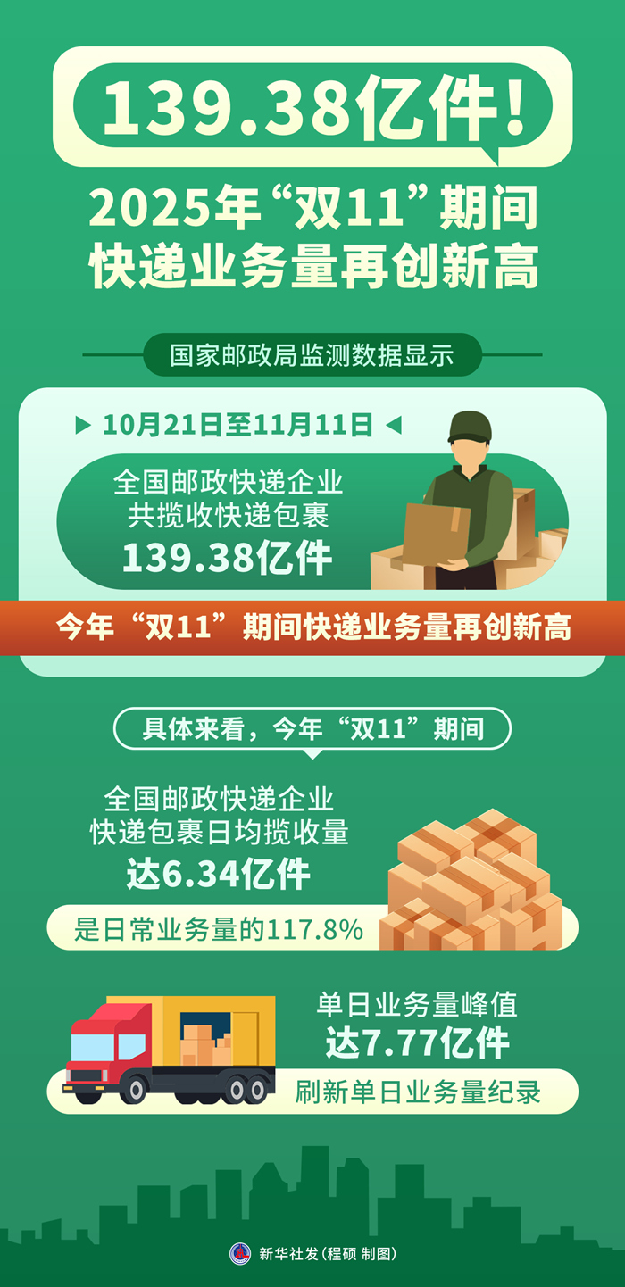 記者11月12日從國家郵政局獲悉,國家郵政局監(jiān)測數(shù)據(jù)顯示,10月21日至11月11日,全國郵政快遞企業(yè)共攬收快遞包裹139.38億件,今年“雙11”期間快遞業(yè)務(wù)量再創(chuàng)新高。